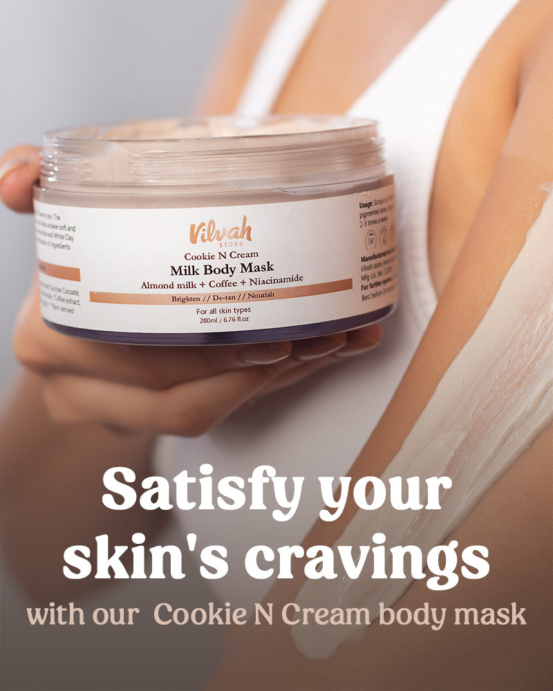 COOKIE N CREAM MILK Body Mask aims to give Smooth, Even-Toned and Glowing skin. The essence of Almond Milk and Coffee in the body mask works on dark patches, Detan and helps achieve soft and supple skin. Shea butter, Argan oil and Olive oil will nourish and moisturise your skin. Niacinamide and White Clay work on dark spots and reduce pigmentation. Binge-On-Milk with the irresistible combination of ingredients which leaves your skin healthy, soft and glowing!!