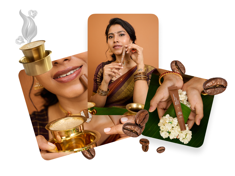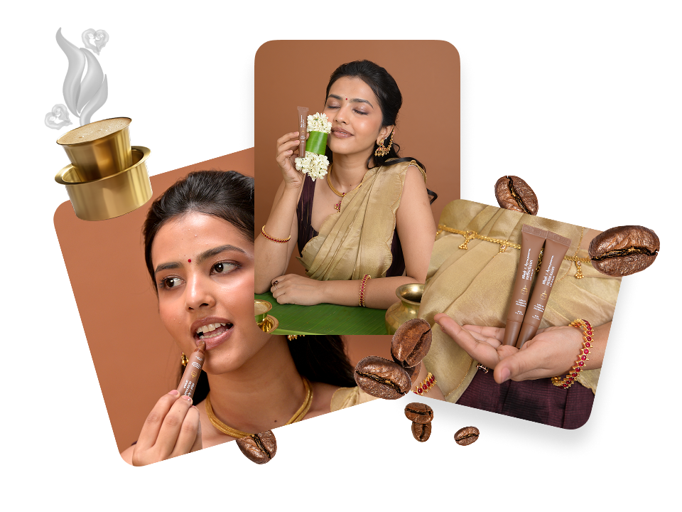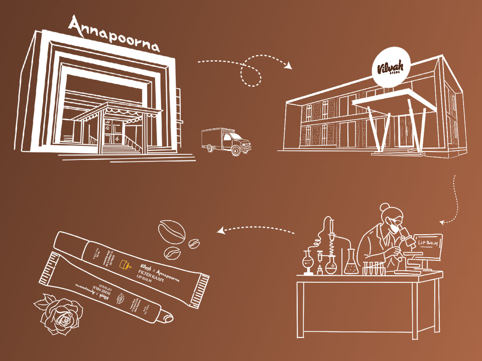 Every morning, once Annapoorna’s Filter Coffees are brewed, the fresh coffee extract is sent straight to the Vilvah factory to be upcycled into our Filter Kaapi Lip Balm.